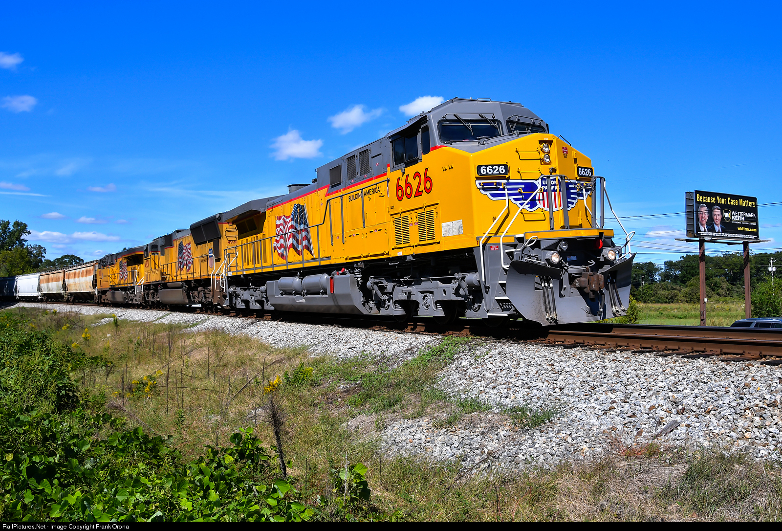 Although it looks like it might have come out of the GE plant in Erie last week, this AC4400 was actually built in May of 1997 for the UP. The fresh coat of armour yellow and Harbormist gray standout nicely against a flawless blue sky this day as a trio of Uncle Pete’s locomotives pull the NS 198 freight train through the city of Opelika.