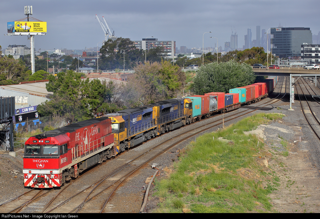 | Returning to Sydney after their first visit to Melbourne, TT class loco's TT107-TT108 trail NR109 on 6MS2 freight at West Footscray. |