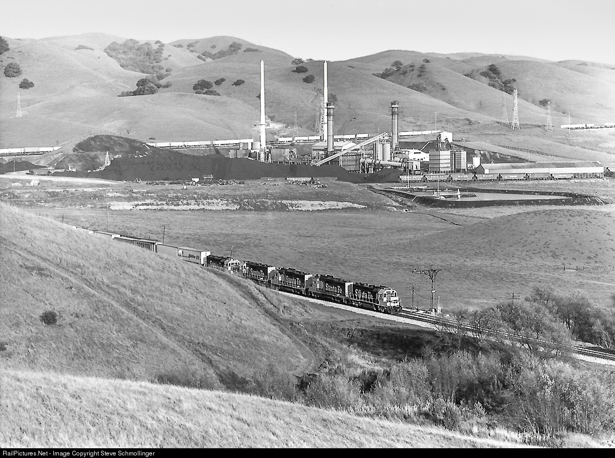 Five rebuilt GP30s and 35s roll downhill through the west side of Franklin Canyon with a monster-sized pig train. In the center of the photo is Union 76's carbon plant. The train is headed for Richmond.