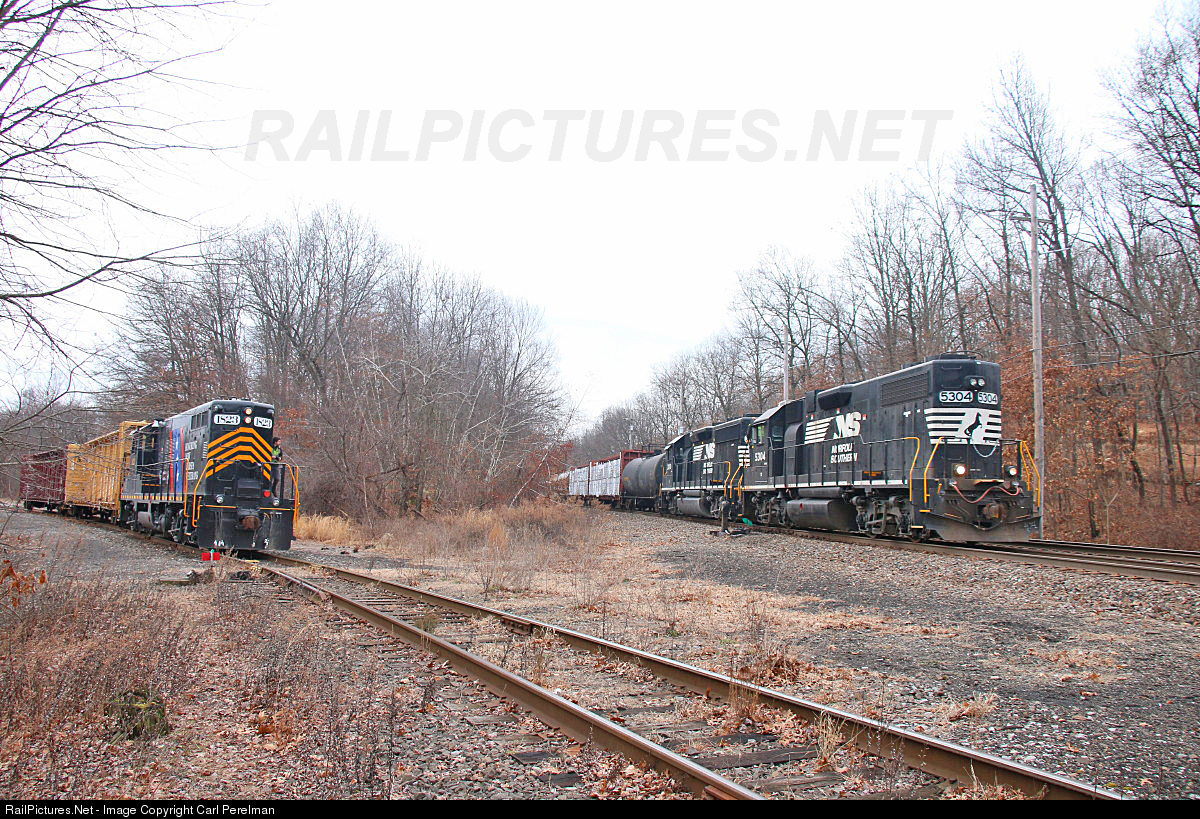 | Norfolk Southern's H-02 and Dover & Rockaway River's D-02 meet at Chester Junction Both trains will interchange, before the D-02 runs east to tie-up in nearby Dover, N.J. In a few weeks Dover & Rockaway River's sister railroad Dover & Delaware River will assume Norfolk Southern operations on the Washington Secondary and correlating trackage rights over NJ Transit. This will mark the end for Norfolk Southern trains in Western Morris County, N.J. |