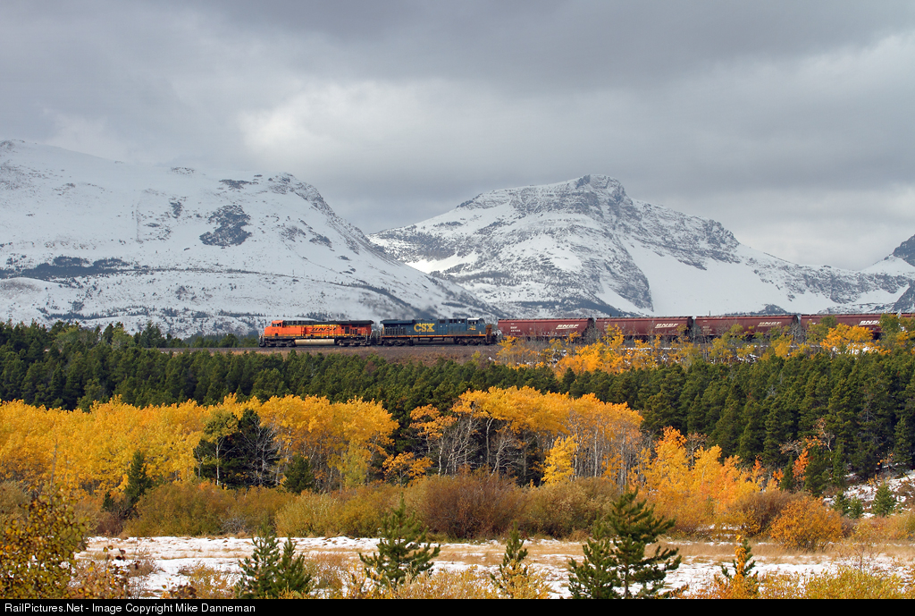 It can’t decide it whether it’s winter or fall as snow mixes with bright yellow trees on Marias Pass as a westbound BNSF grain train approaches the east switch at Bison, Montana, on October 8, 2018.