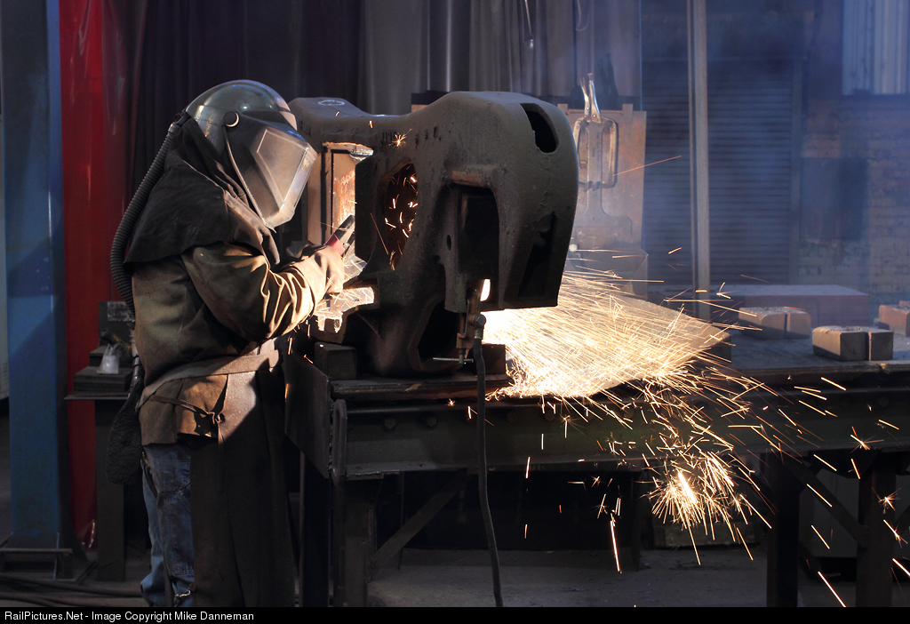 A welder inside Union Pacific’s De Soto, Missouri, car shop repairs a freight car truck side frame on September 28, 2011.
