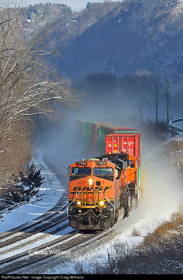 The morning light gleams with fresh snow fall overnight as this eastbound stacker rolls along the Aurora Sub couple miles south of Lynxville. For some reason a massive tree cutting down project went on here along highway 35 and opened up this reverse curve again. Been a long time since a person could shoot here. Weird seeing a train running against the current too, with the old ABS system, things rarely ran against the current. With CTC now in effect, the dispatcher can move trains to and from both mains. This train is about 47 miles south of LaCrosse. Haven't seen alot of snow this year, so the wintry scene is a nice change of pace for me.