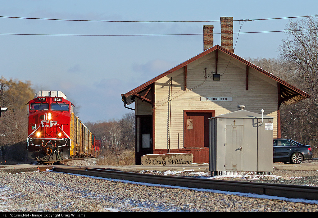 | Westbound hotshot for Canada is this 199. The train is passing the old Brookfield depot on the outskirts of Milwaukee. The train is setup 1x1 as the 2 GE's work to get the train up the grade out of Milwaukee. In a few miles the train will cross the CN Waukesha Sub at Duplainville. The train is about 80 miles from the next crew change point at Portage, WI. |