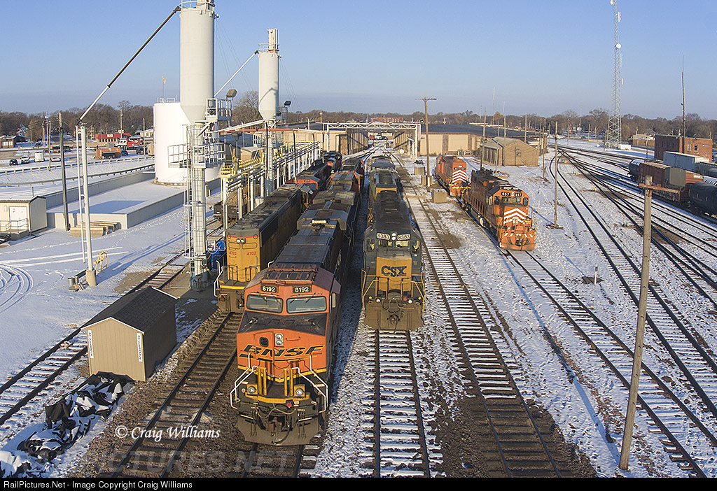 Morning time at the Waterloo roundhouse. If things are on time, most mornings will find the most power at Waterloo as the railroad prepares for the normal departures of trains. On the far left will be 571's power, the middle is BNSF 338's power, and right is CSXT U704's power, and then the sand track which holds the switch engine power for the yard is on the far far right.