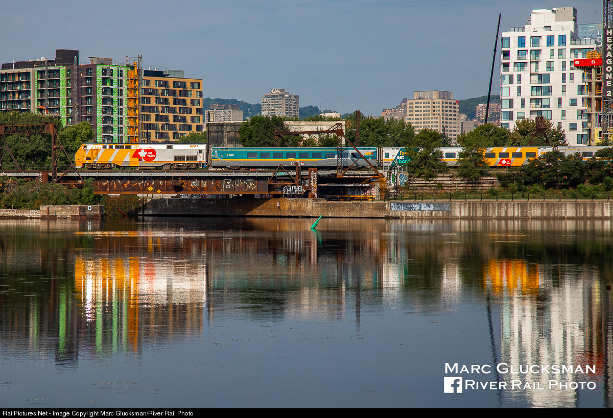 | Reflecting on Saturday morning. VIA 906 (P42DC) leads train of former LRC coaches out of Montreal's Central Station (Gare Central) on the morning of Saturday, August 25, 2018. Peel Basin was formerly a very industrial area which has in past years been cleaned of its abandoned and closed factories and rails and is presently being transformed into a beautiful park. |