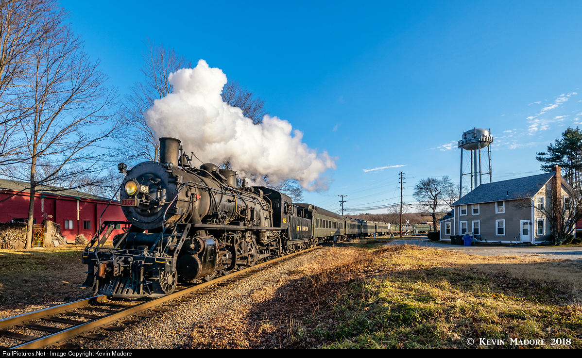 The Essex Yard Shuffle. Valley Railroad Mikado #3025 hauls an 8-car train of heavyweights out of the Essex Yard in the late afternoon sun in what looks like the first North Pole Express of the day......except that's not what's happening here. The first NPE isn't due to leave for about 45 minutes and by then the light won't be nearly as nice. No, the 3025 crew is in the midst of what I call, the "Essex Yard Shuffle", a carefully choreographed set of moves designed to position all of the Valley's train-sets for the nighttime NPE operation. Just a few minutes prior, the 3025 and her train were occupying the run-around track in the yard, leaving the platform clear for VALE 40 and the last of the Santa Specials (SS-6) to arrive and discharge passengers. With that operation complete, the 40 has since pulled south out of the yard and across Rte 153, clearing the platform track. In the move you see here, 3025 then pulls her train north, out of the yard and across Rte 154, until she clears the north yard switch. In just moments, she'll reverse direction, backing her train onto the platform track, where she'll be ready to load for the 3PM NPE-1 train. Once she's positioned, the 40 will then shove back north, putting her train on the run-around track with the locomotive still on the south end. There, she'll wait until NPE-1 leaves at 3PM, when she'll once again pull south to the south switch, then push north, positioning her train on the platform track and then run-around to pin-on the north end to be ready to depart as NPE-2 at 3:30PM. Meanwhile, VALE 97, will come out of the engine house and once 40 is in place, she'll pin on to the south end of her train, which has been parked on a storage track. There, she'll wait until NPE-2 leaves, before pulling south to the south switch and pushing north to position her train on the platform track and then running around to pin-on the north end. VALE 97 will be NPE-3 at 4:30PM.