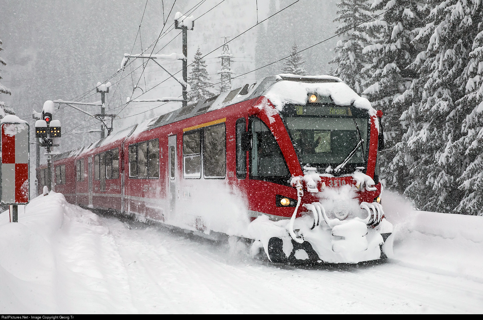 | "Allegra" railcar ABe 8/12 # 3510, running as train 1429 from Chur to Arosa, is entering Litzirüti station in heavy snowfall. |
