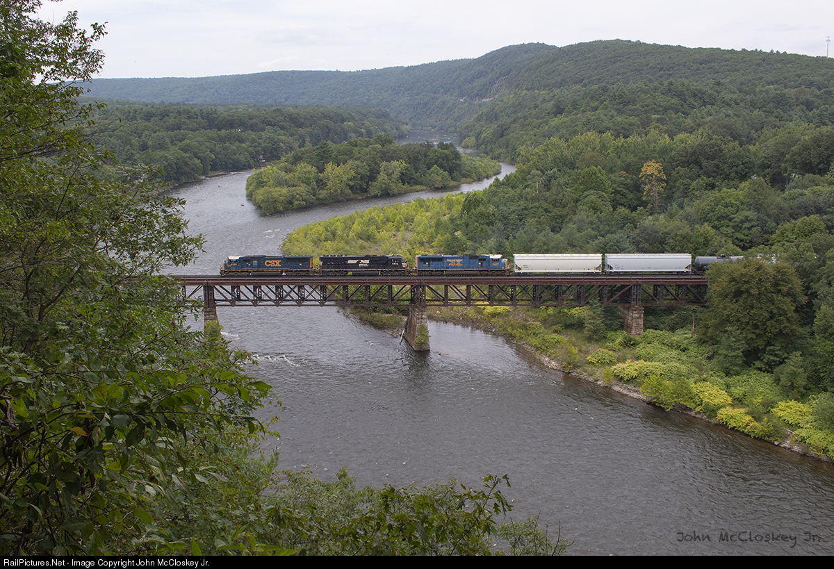 A Saturday extra SU-99 is seen crossing the Millrift Bridge across the Delaware River with a trio of CSX/NS leasers for power, due to the regular road power for the NYSW being out of service due to a derailment.