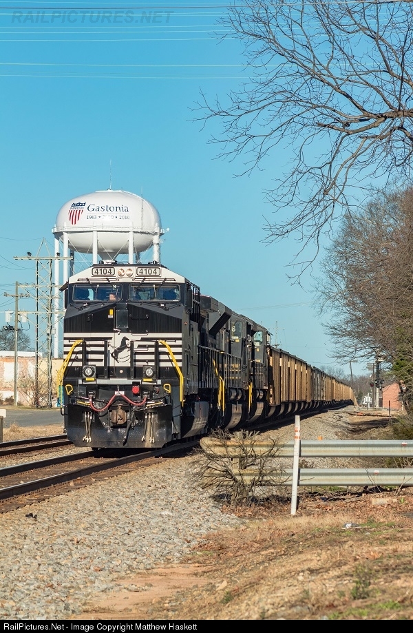 | NS 744 sit's tied down at Gastonia waiting for a new crew to take the train to the Allan steam station in Belmont, NC. The locomotive leading is a brand new AC44C6M rebuild #4104. |