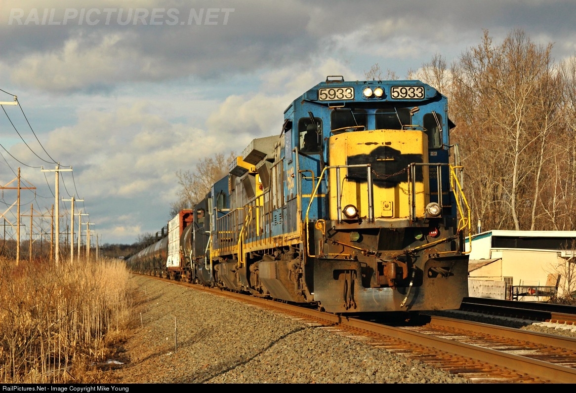 East Deerfield, MA - Plainville, CT manifest finds the sunlight in Newington with an Ex CSX B40-8 leading. MEC 5933 just recently got cab signals to run on the Springfield line.