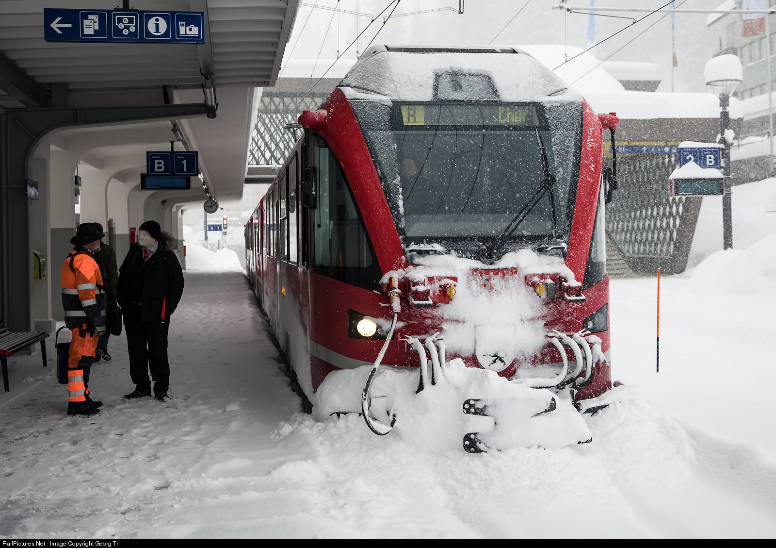 | Train 1421 of the Rhaetian Railway after arrival at the final destination Arosa. The railcar ABe 8/12 "Allegra" proved itself as a snow plough. On this day, the trains were run without additional cars ("Allegra" railcar only), for better adhesion conditions and greater flexibility if a train had to be turned over prematurely due to an interruption of the line. |