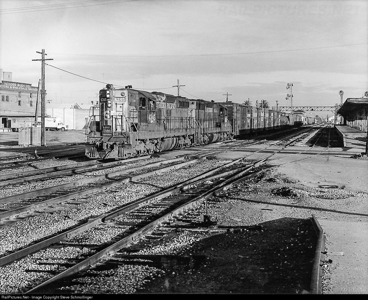 Early in the morning, SP 4345 West hustles "compass" southward through downtown Stockton, CA. The train originated in Roseville, CA.