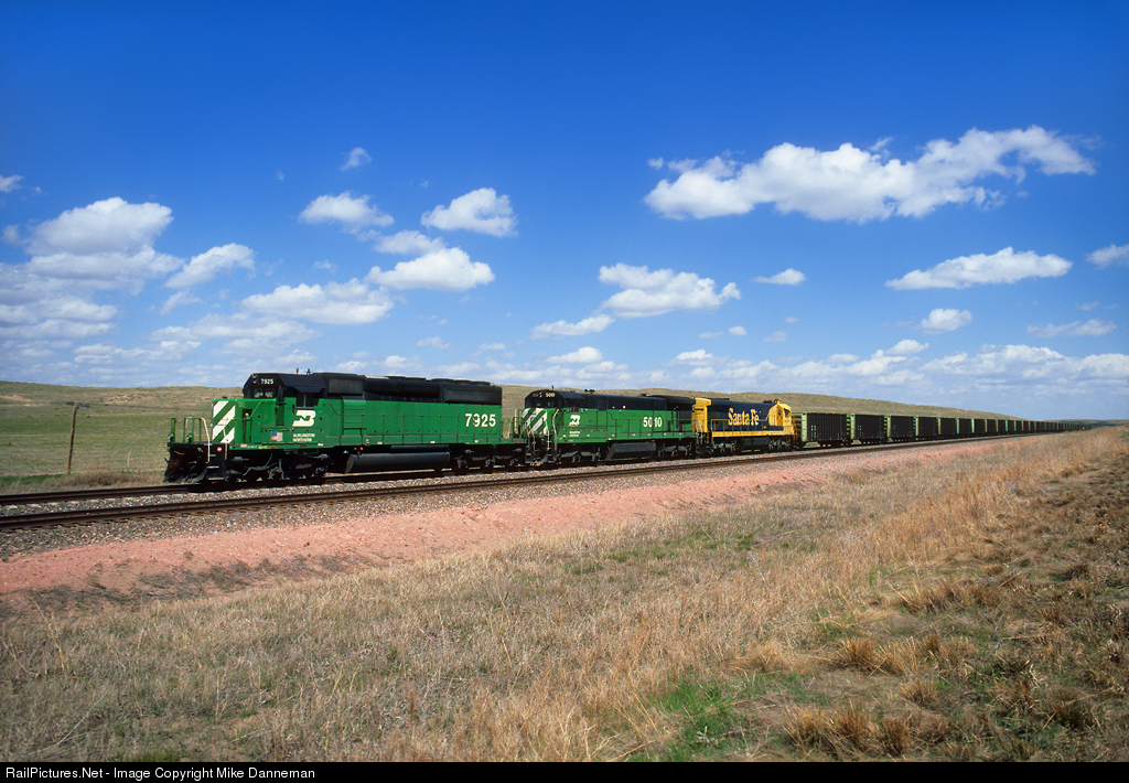 It’s just a “wedge” photo in the Sand Hills of Nebraska, but the Cascade green on this westbound Burlington Northern coal train sure looks nice on the early spring day of May 11, 1995. BN EMD SD40-2 No. 7925 leads a pair of GE C30-7s in BN and Santa Fe flavors on this coal empty west of Antioch.