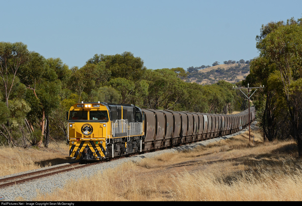 | Watco Rail WA has made its two DR locomotives available for grain haulage duties, as CBH Group has a unit shortage. DR1564 and DR1565 bring 4K04 grain from York through the old GSR siding of Muresk on Wednesday 9 January 2019. |