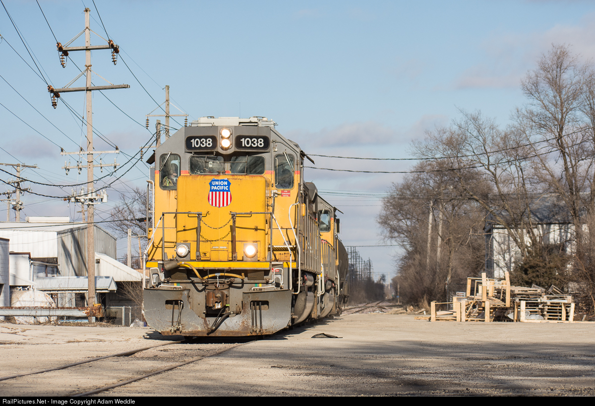 | The former CNW KD line features both street running and parking lot running. Here, UP 1038 is seen on the parking lot running portion of the line as it makes its way back towards Rockford with a single car from Rock Valley Oil. |