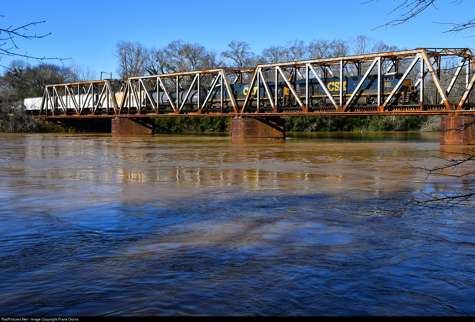 | The Chattahoochee River is riding a little high this January day as the remnants from recent days of rain flow to the Gulf. Q602 and its 7400 feet of train keep on moving though as the 2X1 DPU train crosses atop the 1914 built bridge. To see how much higher the water is, click here. |