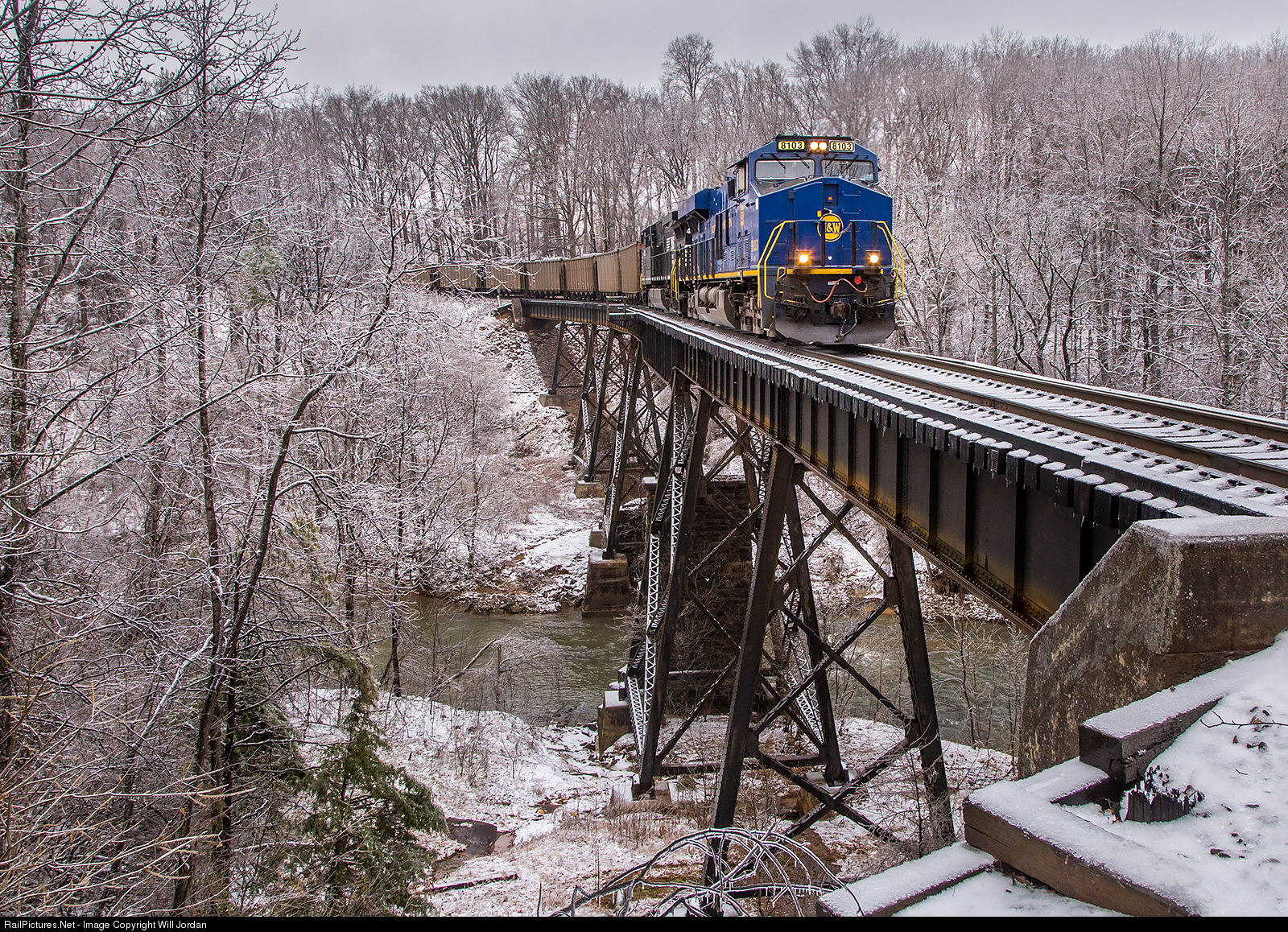 | The commemoratively painted Norfolk and Western heritage unit looks right at home leading southbound loaded coal train 746 down the former N&W "Pumpkin Vine", spanning a curved trestle north of Rocky Mount, Virginia, crossing a small river cutting it's way through the frosty Virginia hills. |