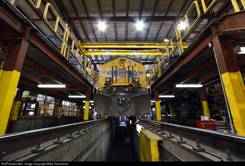 | Union Pacific GE AC4400CW No. 6227 sits in the locomotive shop at South Morrill, Nebraska, on September 15, 2017. |