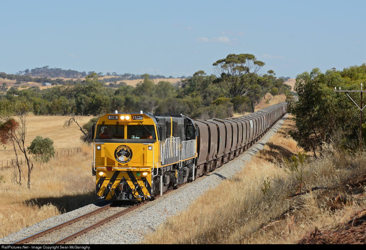 | Watco WA Rail's DR class locomotives DR1565 & DR1564 pair up to work a loaded CBH grain train from York to Kwinana. The pair are captured here near the former Burges Siding on the GSR line between York and Northam. |