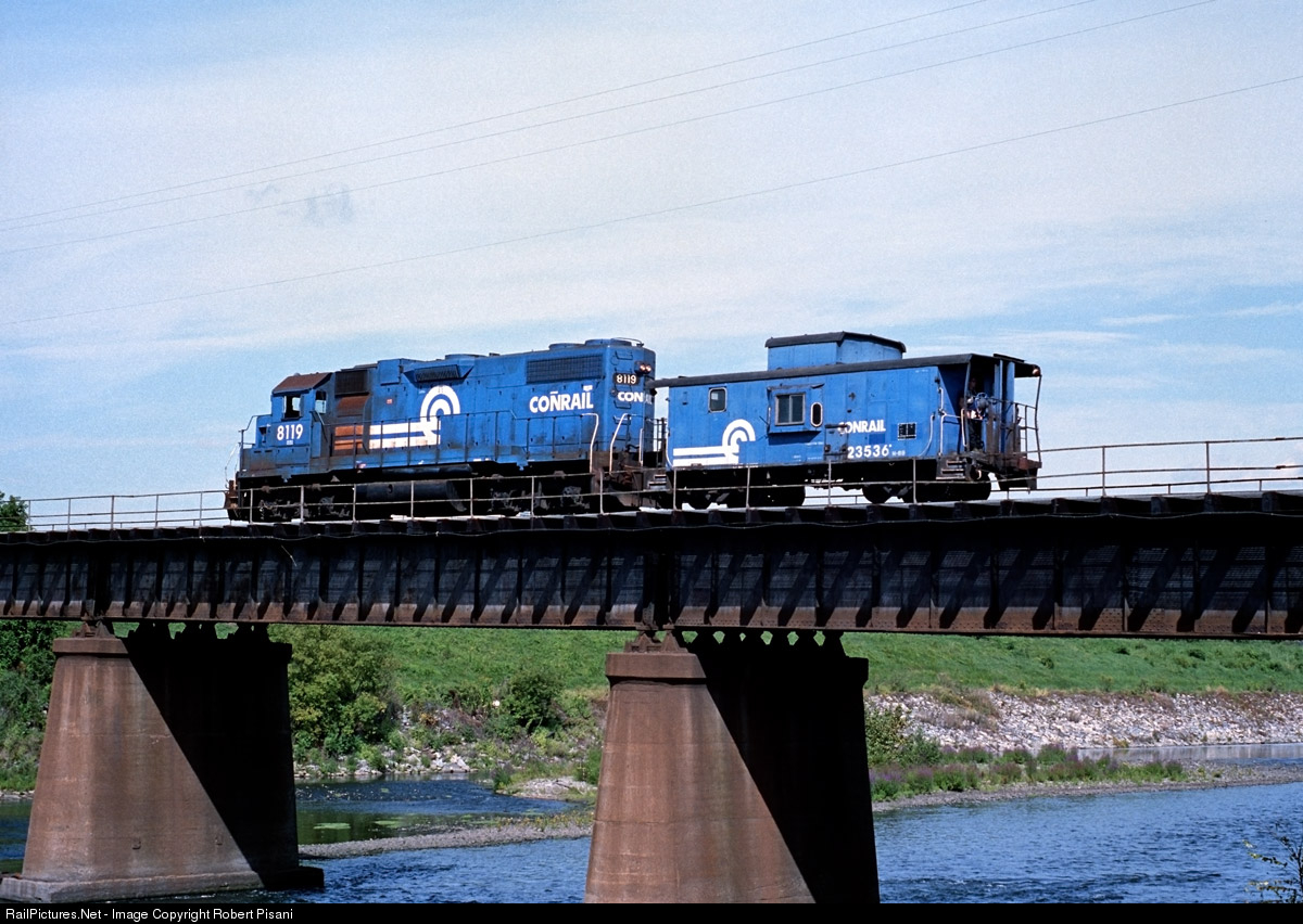 Conrail WPAL-12, the East Penn Drill, heads west across the Lehigh River as a "caboose hop". Trailing the single GP38-2 is a Conrail N-8B caboose. This car was rebuilt by Penn Central from New Haven NE5 caboose #545. During rebuilding, N8Bs had the cupola windows blanked and a water tank suspended from the ceiling in that location. A bay window was also added to the car sides, making for a very unique-looking caboose.