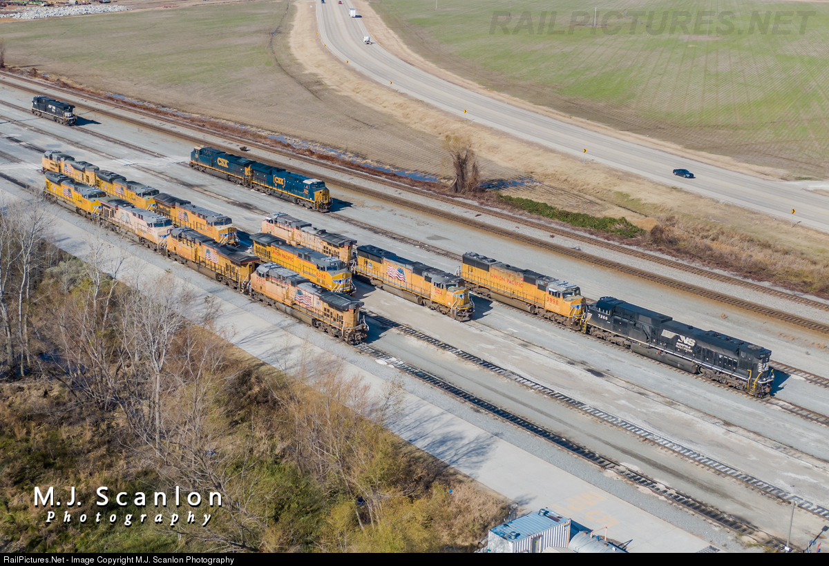 | Built as SP 9823 in 1994 for the Southern Pacific, UP 3998 and NS 7266 (ex-SD9043MAC UP 8038 now a SD70ACU) begin to pull away from the pack at the Union Pacific Marion Intermodal Railport in Eastern Arkansas near Memphis.