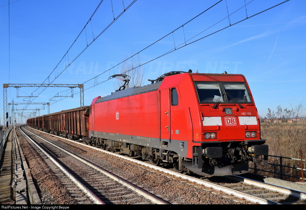 The loco E-483-106 of "DB Cargo Italia" is at the head of a freight train going south.