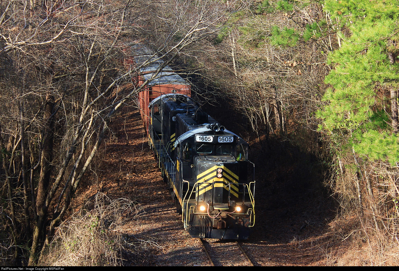 The Mississippi Central Railroad made a rare trip to Oxford to pick up 38 box cars to bring back to Holly Springs. This photo depicts the lead unit coming out of the woods, about to cross under HWY 7.