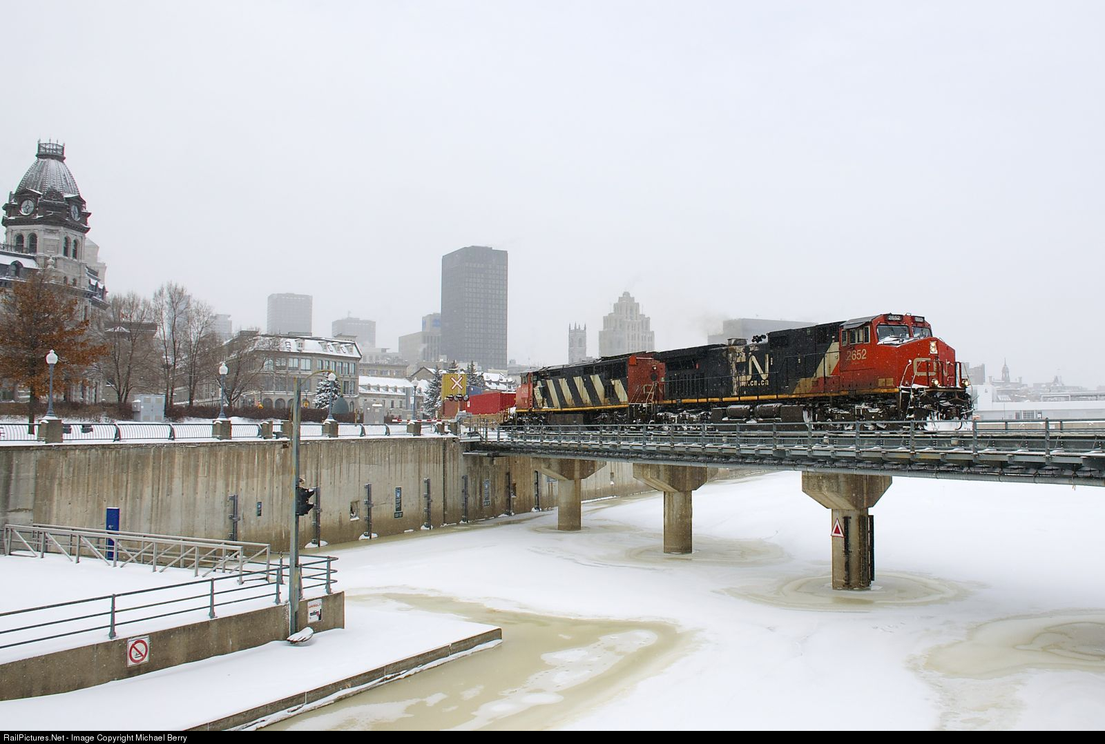 A late CN 149 is crossing the Lachine Canal with CN 2652 & CN 2409 for power on a frigid day after Montreal received a large snowstorm.