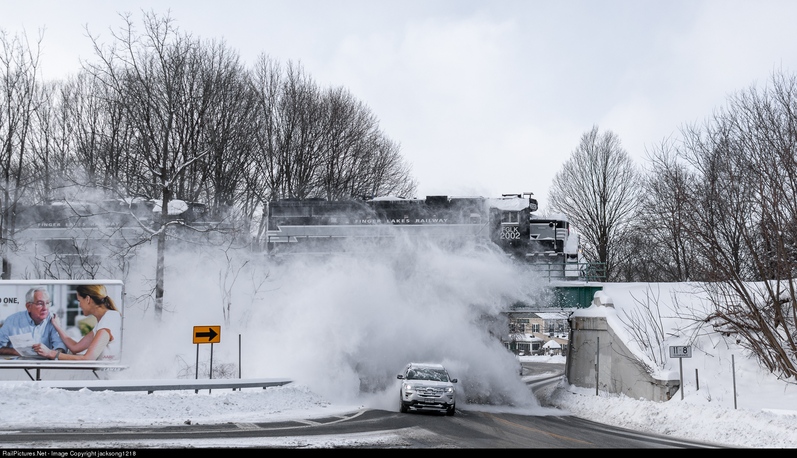 | After winter storm Harper dumps 20+ inches on western NY, Fimger Lakes Railway train GS-2 is the first train over the line since the snow. The lead locomotive blasts snow off of the bridge, where it lands on an unsuspecting car below. |