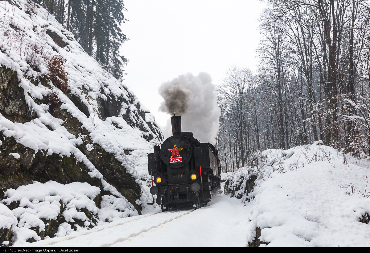 | ČSD 2-8-2 Tank steam locomotive #431.032 "Ventilovka" (former Austrian Railways BBÖ 378.60 and ÖBB 93.1360) is pulling a photo freight train through the winter landscape of the Jizera Valley in the "Krkonoše" (Giant Mountains). |