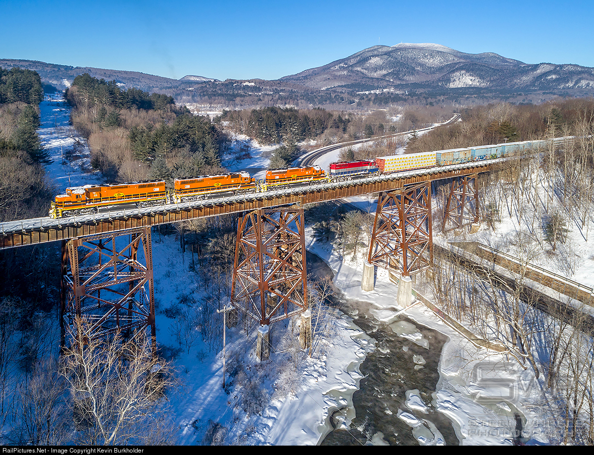 Arctic cold air following a weekend New England snow storm caused significant delays for the normally nocturnal New England Central Railroad freight train 324-21 from St. Albans, Vermont to Palmer, Massachusetts. Led by NECR SD40M-2s 3474 and 3476, SD40-2 3320, and GP40-2L 3040, 324-21 crosses high above the Sugar River in Claremont, New Hampshire, as Mt. Ascutney looms in the distance on the bitterly cold morning.