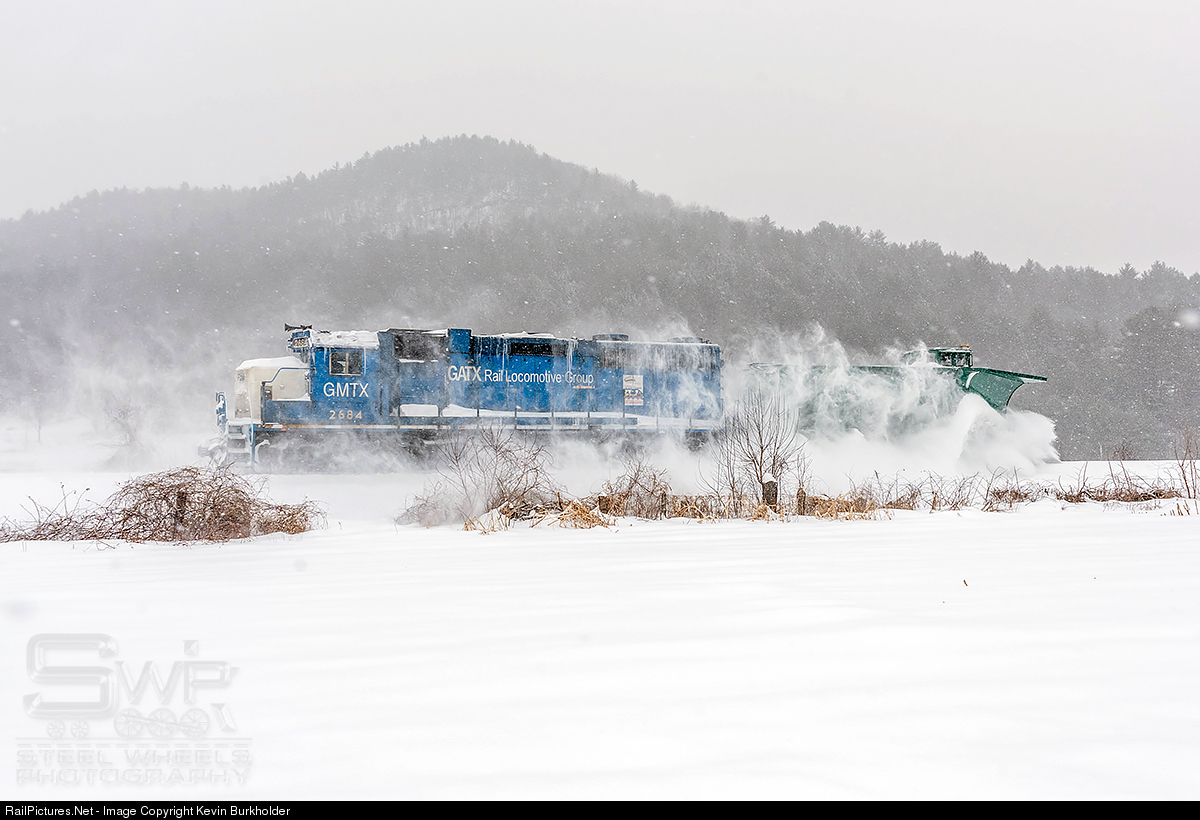 | On January 20, the Green Mountain Railroad's Bellows Falls Plow Extra is seen moving snow as the train heads eastbound through Chester, Vermont with GMRC Russell Plow X106 being shoved by the GMTX GP38-3 2684. |