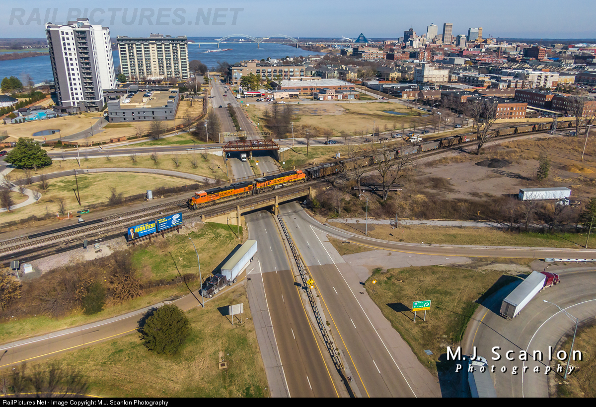 An empty Scherer coal train is heading for a Mississippi River crossing on the BNSF Frisco Bridge, as it rolls through downtown Memphis on the Thayer South Sub.
