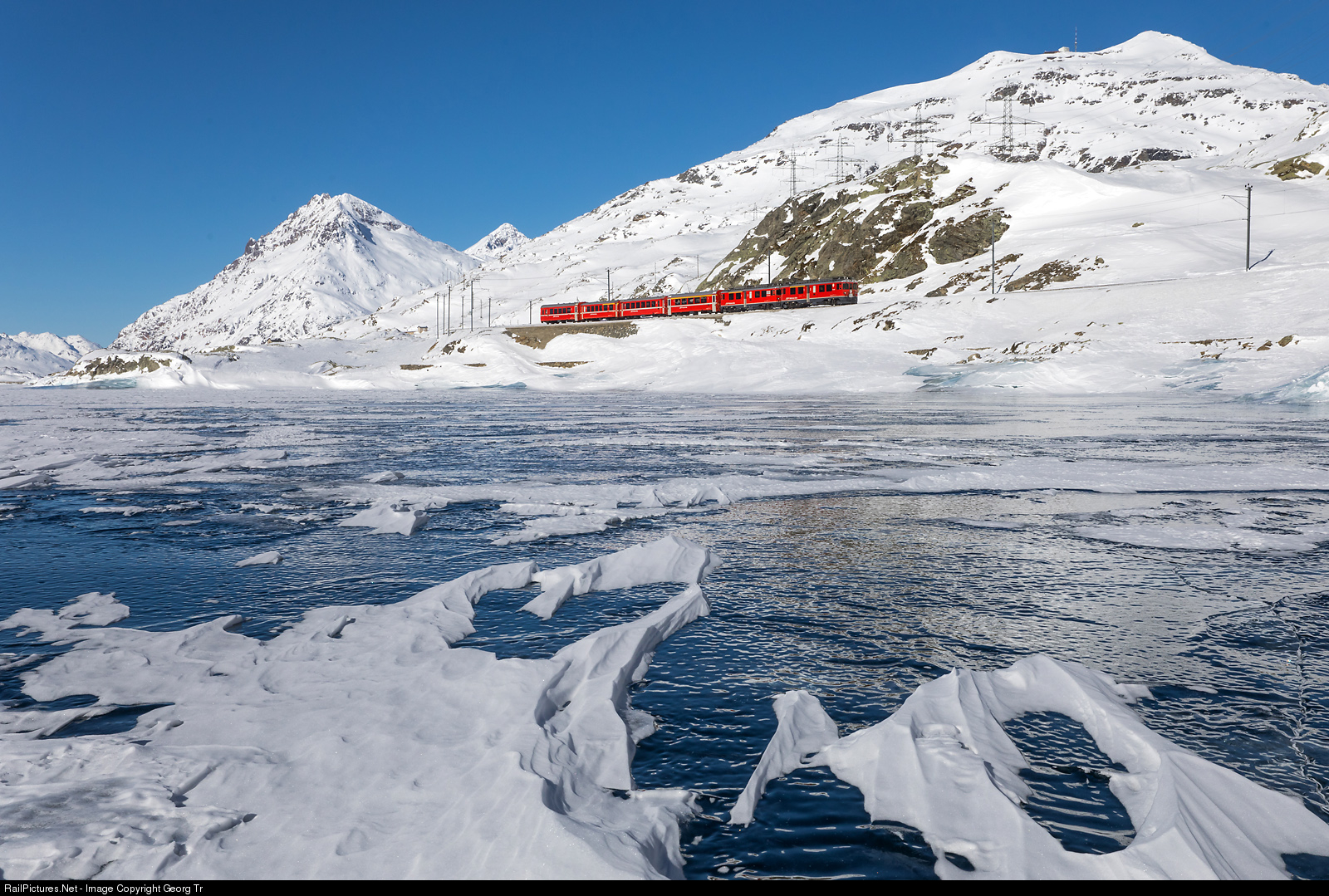 Bernina pass line of the Rhaetian Railway along the frozen Lago Bianco on about 2250 meter a.s.l. Railcars ABe 4/4 # 52 "Brusio" and # 55 "Diavolezza" are pulliing train 4629 from St.Moritz to Tirano. The ice is estimated about 30 to 40 centimeter thick (11 to 15 inch). In the background 3166 meter high Piz Albris (left) and 2959 meter high Piz Lagalb (with the station of the ropeway).