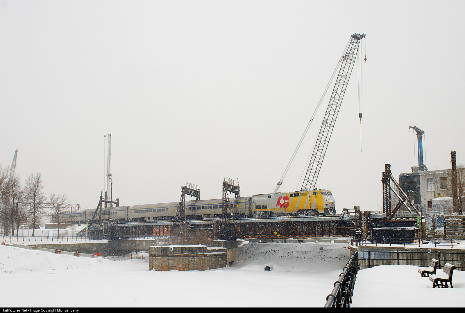 VIA 34 with VIA 920 and four HEP cars crosses the Lachine Canal on a snowy afternoon in Montreal. In the background, preparatory work for the REM (Réseau express métropolitain) light rail project has begun.