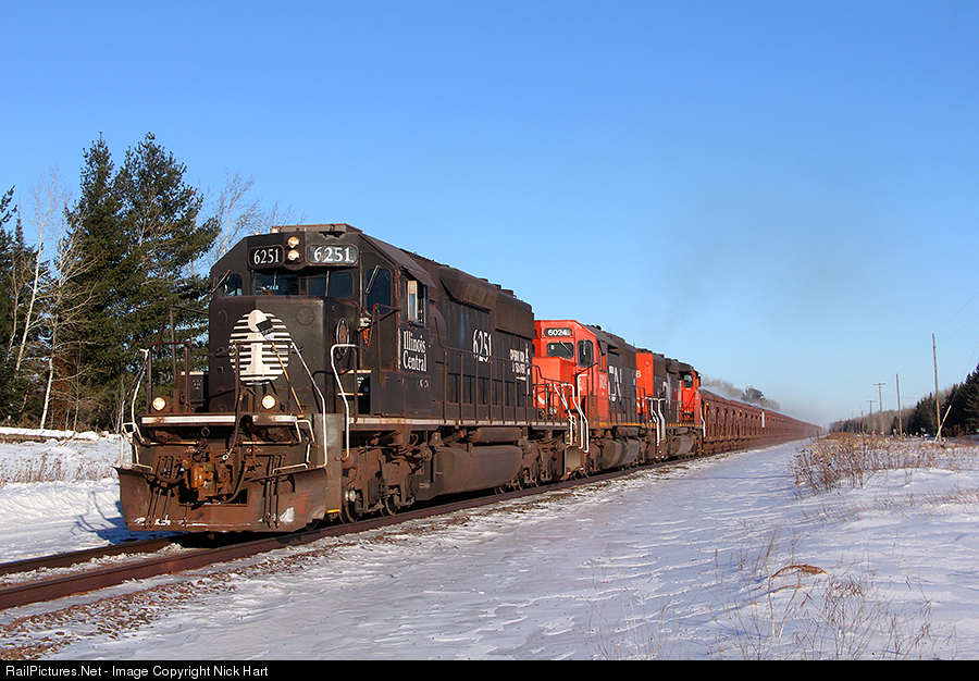 | While IC 6251 isn't the only deathstar SD40 remaining on CN's roster, it is in fact the last deathstar SD40 wearing the white frame stripe. With help from a CN SD40u and an SD40-2W, 6251 makes its way south through Zim. |