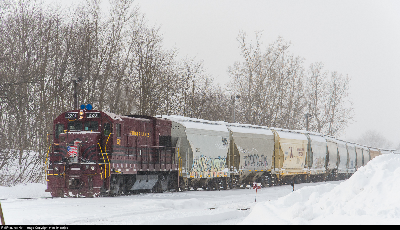 As winter storm Harper dies down, The Finger Lakes Railway GY-1 switches cars in the Geneva Yard with U23B 2201, painted in the Lehigh Valley's Cornell Red scheme.