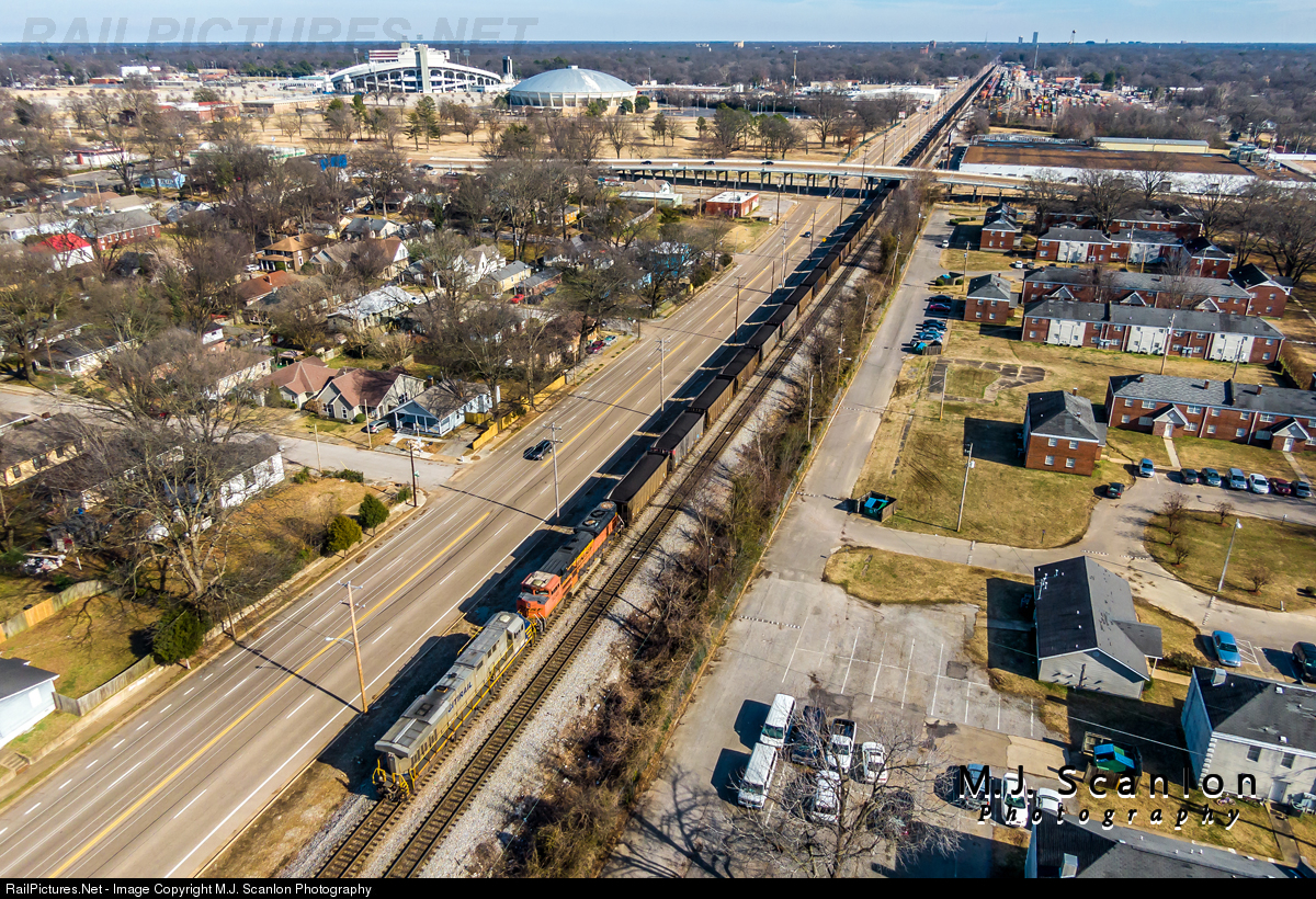 | The DPU's of a loaded Scherer coal train are near Cooper Street as the head end is at the east end of NS Harris Yard. Two iconic structures of Memphis are seen in the distance. Liberty Bowl Memorial Stadium to the left and the Mid-South Coliseum on the right. |