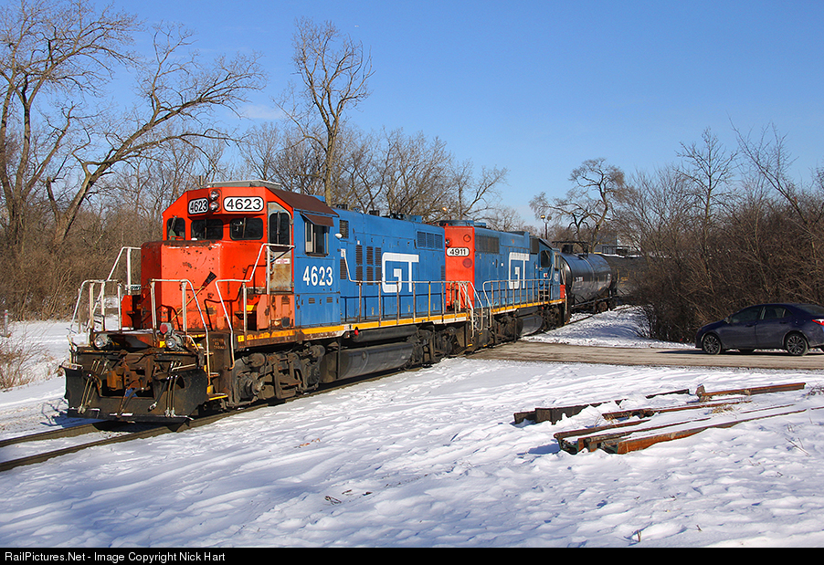 | On a cold and crisp winter's morning, GTW GP9R 4623 and GP38-2 4911 lead L545 out of Rowell Chemical in Willow Springs. Both units still maintain their classic Grand Trunk paint. |