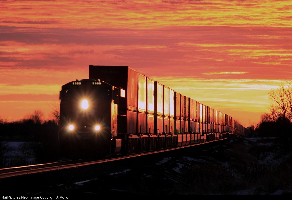 CP 8955 leads its train west near Indus, AB. I captured this photo just a few minutes before the sun appeared over the horizon.