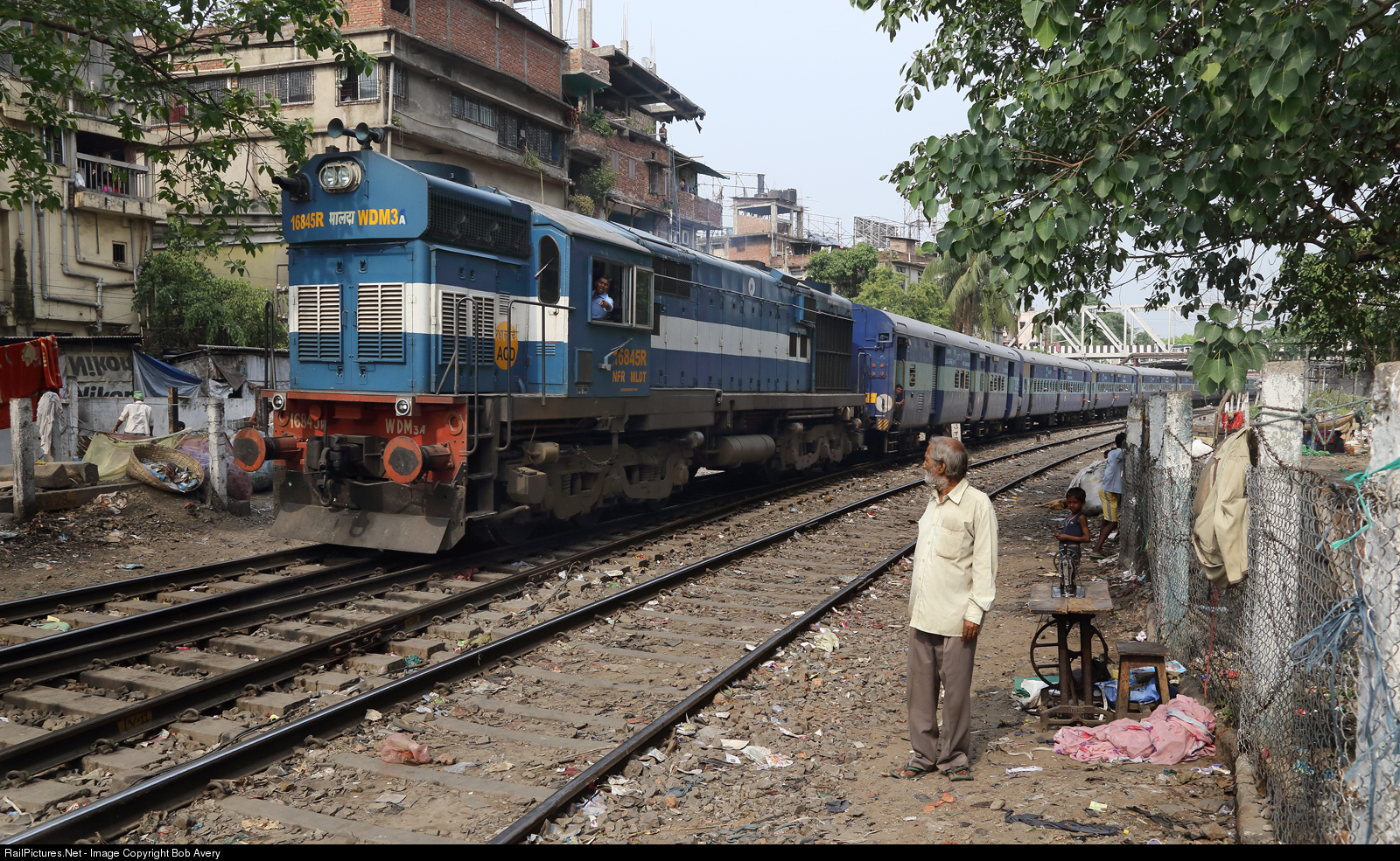 Indian built WDM3 16845 leaves Guwahati with an afternoon train, 12th April 2015. The IRFCA website lists this as a WDM2 but the loco itself states otherwise. I don't know what the R suffix indicates. There is much trackside life to observe here. The simplest of trackside businesses - altering clothes and sewing jobs - takes place in the open air, though the proprietor has temporarily disappeared. The driver is trying to warn the considerable trackside population - including some Western photographers - of another approaching train from behind.