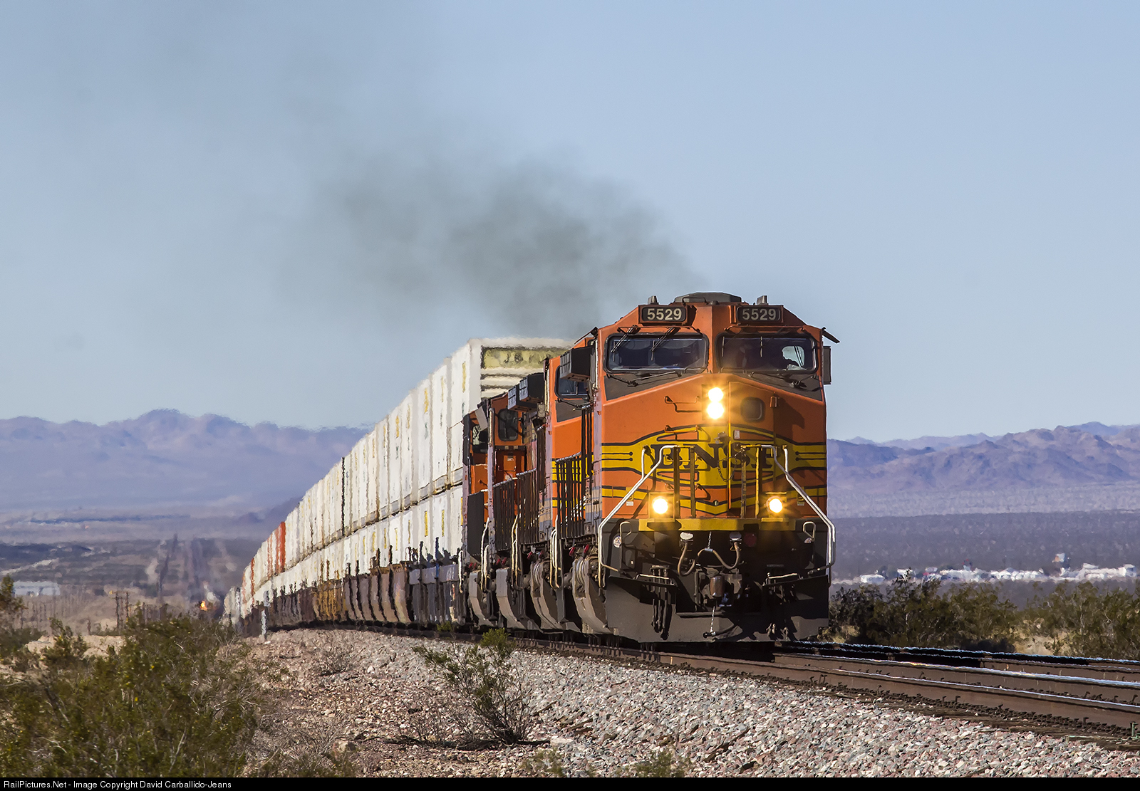 Four for the Price of One! Traffic is starting to backup at along the Needles Subdivision at Bolo Hill. Following right on the heals of another eastbound train, BNSF 5529 pulls a San Bernardino, CA to Alliance, TX intermodal Z-train over the crest of Bolo Hill. In the background, three trains can be seen. An eastbound and westbound trains slowly move through Amboy while another descends down from Siberia. There is another train (making it five trains), but it is hidden behind the eastbound Z-train.