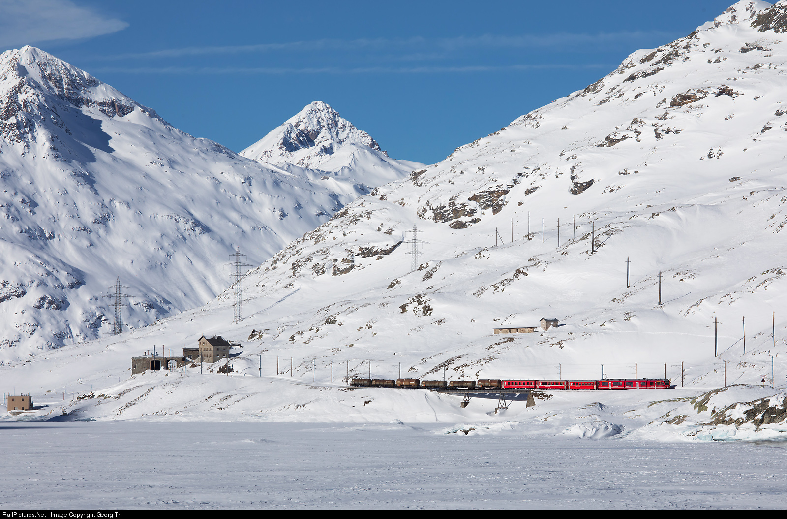 | Passenger or freight train? "Allegra" railcar ABe 8/12 # 3511 of the Rhaetian Railway is pulling train 1633 from St.Moritz to Tirano along the frozen and snow covered Lago Bianco on about 2250 meter a.s.l. In the rear of the train are 6 empty fuel oil tank cars, added at Pontresina and going to Campocologno. The train is crossing the bridge "Al Lago" (at the lake), which was built in 1949, when the line in this section was relocated from the slope, to avoid snowdrifting. On the left the large staff house at Ospizio (now rented out as holiday lodging) and the covered turntable for the steam snow blower (now used as covered stub track). |