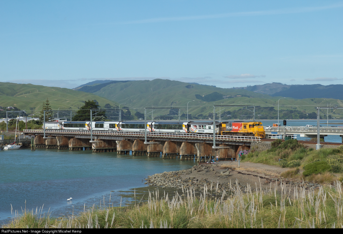 Trains on 3' 6" (1.067m) track from Whangarei to Bluff with virtually heritage rebuilt EMD and GE locomotives still the mainstay power. The network was privatized in 1990's and operated by Toll until 2008 when state owned KiwiRail was established.