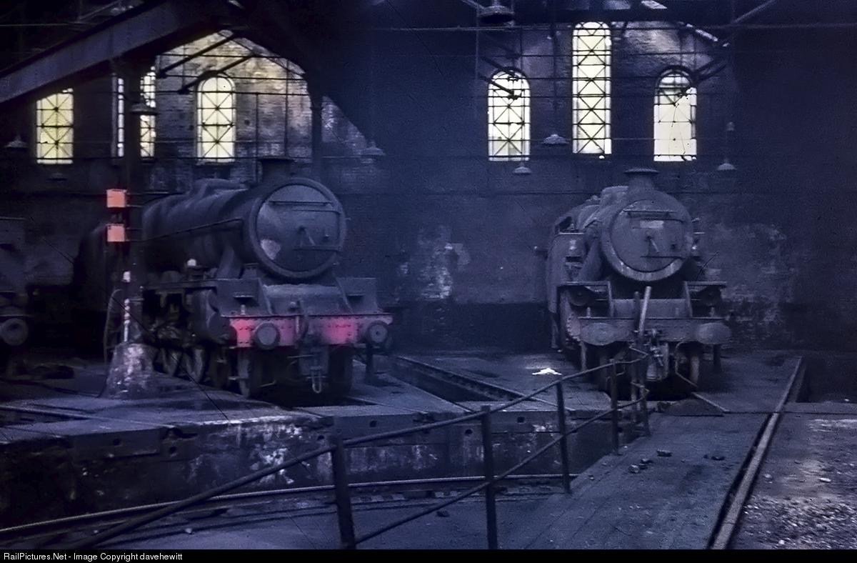 The end of steam is approaching on British Railways and it shows. Locomotives were run until they could run no more and then sent for scrap. With only a few weeks before steam disappeared in the Leeds area of Northen England, a sad scene in Holbeck motive power depot. A 4-6-0 and a 2-6-4 tank await their fate in dilapidated surroundings