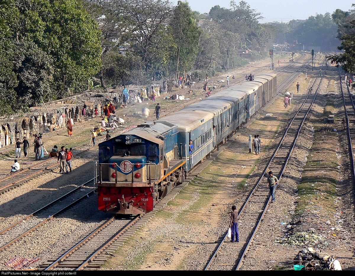 | Metre gauge, Hyundai/Rotemn loco No 2910 heads away from Chittagong with train 37, The Mymensingh Express, 1510 to Jagannathganj Ghat. |