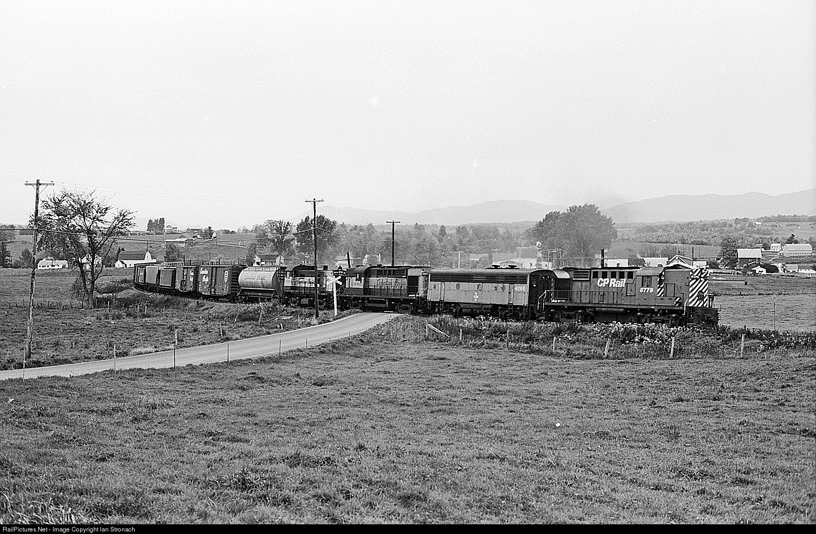 Train 904, with an interesting lashup of pooled CP and B&M power (RS-18/F7B/RS-10/RS-23), climbs Newport Hill. 904 was one of the hottest "fast freights" on the CP, running from Windsor, ON to Wells River, VT. At Wells River it became B&M 8904 and continued on B&M track to White River Jct., VT for forwarding to Boston and Springfield.