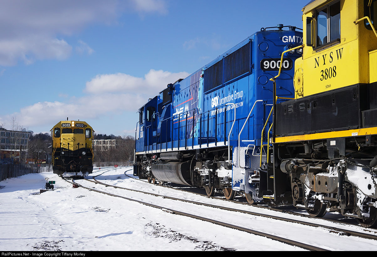 The New York, Susquehanna & Western road train has arrived with borrowed power and the local crew will bring the train to CSX. Locomotives on the road train: GMTX 9000, NYSW 3808, NYSW 3810 and CSXT 9027. Local crew waits in NYSW 3022.