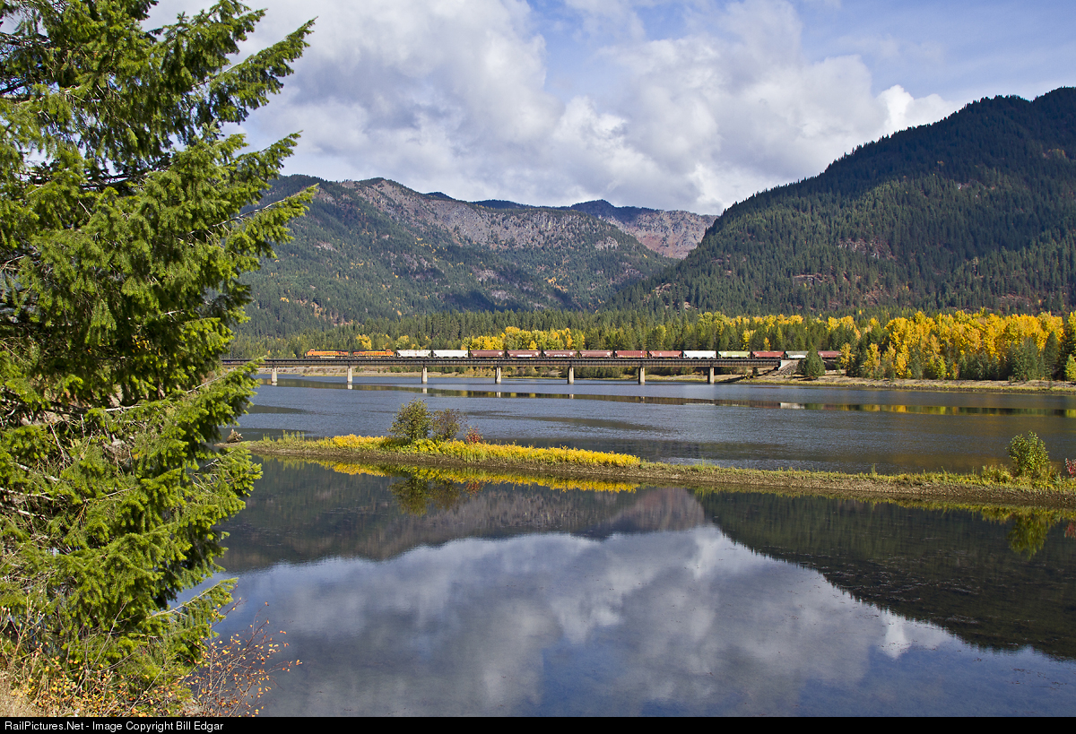 | A BNSF grain train adds a bit of additional color to the beautiful green and gold along the Clark Fork at Noxon, MT. The train is on Montana Rail Link and soon will return to BNSF trackage at Sand Point, ID. |